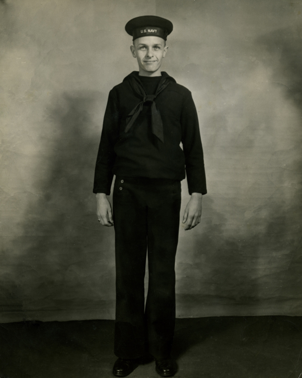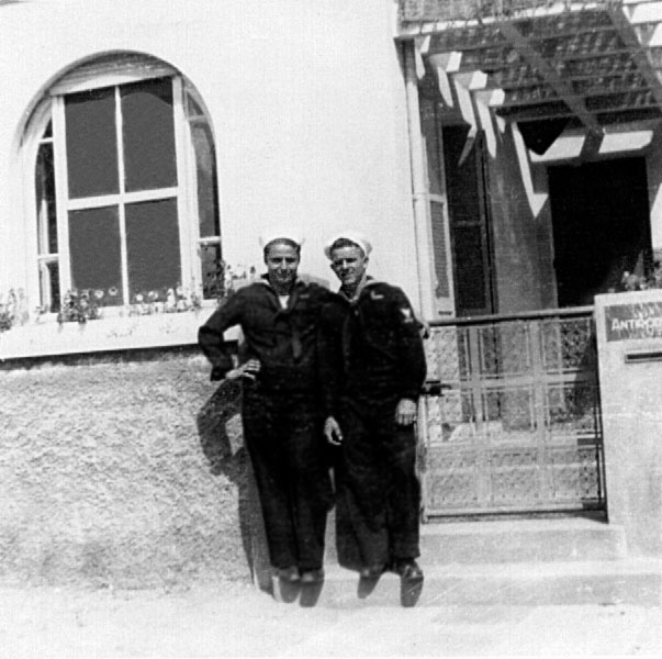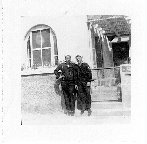 Corrected creases and scratches. Corrected fading. Removed sun spot in window. Resized the image to focus on the sailors. |