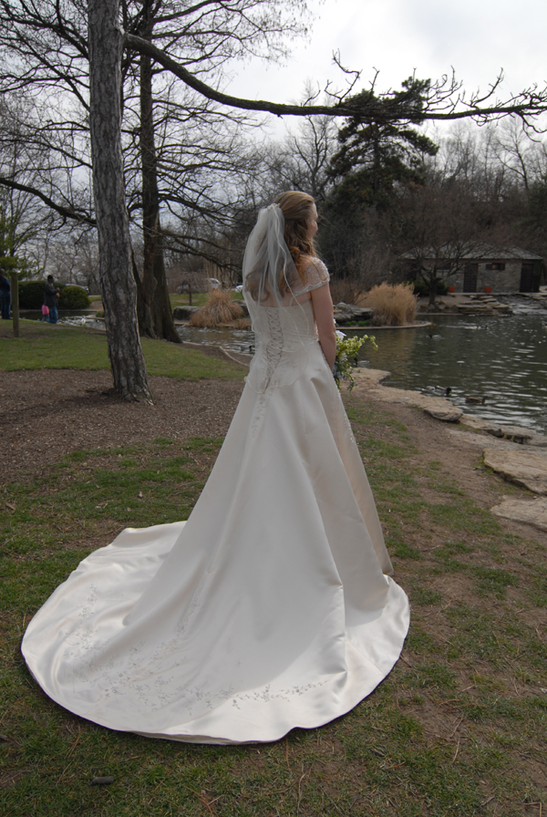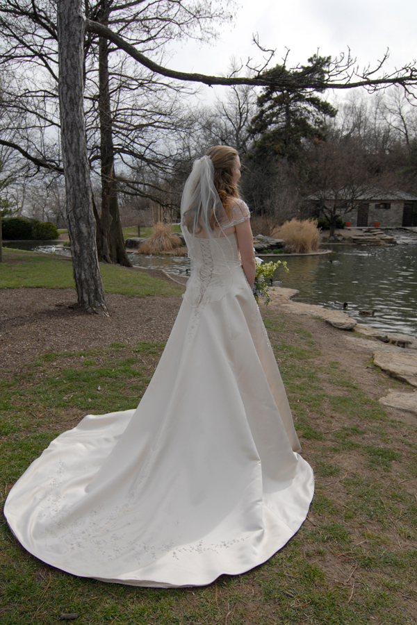 Removed person from the leftside of the picture. Removed the cars in the middle of the photograph. Brightened portrait and cropped photograph to create the bride as the focal point of the photograph. |